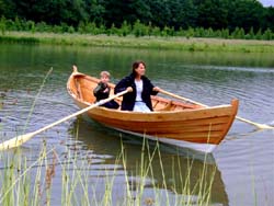 ‘We’re digging a lake, and building a boat house, and now we need a boat.’ That was the brief from a couple from West Sussex who wanted a 15ft rowing boat for their family. The delivery date was two weeks hence, May 2007, in time for a father’s birthday, which was too tall an order, so the boat was delivered a year later, in time for his next birthday. The boat is essentially a scaled down version of my standard 18ft sjekte, with correspondingly more beam. At 5ft 6in it’s a little skinny at that length, but at 15ft it’s fine, making for a wider, more stable boat that proved easy to row and safe. The form is almost symmetrical fore and aft, with a bold sheer forward which sweeps up slightly at the stern. The price was around £4,500, finished clear varnished inside and outside, with a white bottom to set things off nicely. I have to say that the planking was a joy, the strakes almost made themselves, so sweet were the curves. They conformed almost effortlessly to the moulds, and there’s little or no tension anywhere, which promises longevity. The boat was launched in June 2008.